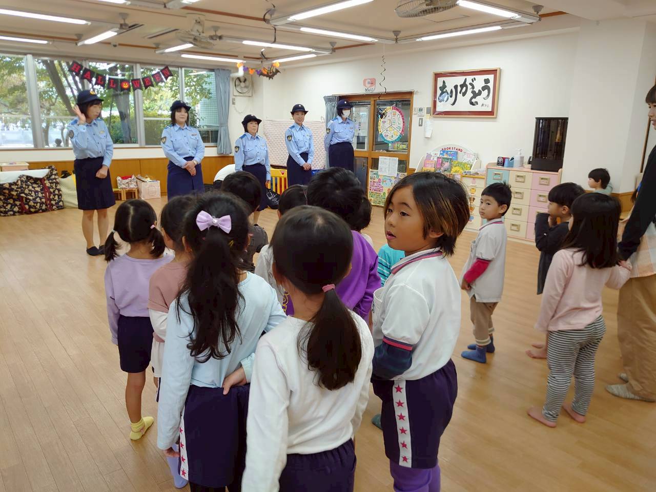 交通員の方々にちょっと緊張気味の子どもたち。